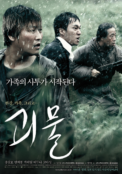 다시 4년 뒤, 한강대교에서 투신하기 직전의 한 남자가 강물 속에서 무언가 크고 시커먼 게 있다고 나지막히 이야기 합니다. 옆에서 계속 자살을 말리던 지인들은 이해하지 못하지만, 그는 결국 잘 살으란 말과 함께 강물에 몸을 던집니다. 햇살 좋은 주말 오후, 아버지와 한강 시민공원에서 매점 일을 하고 있는 '박강두' 는 매일같이 졸기만 하고 장사에 의욕이 없습니다. 그의 아버지 '희봉' 은 졸고 있는 아들의 뺨에 붙은 동전을 떼서 거스름돈을 손님께 건네며, 아들 '강두' 를 깨워 오징어를 구워서 배달하라고 시킵니다. 오징어를 배달하다가 다리 하나를 뜯어먹던 '강두' 는 중학생 딸인 '현서' 가 돌아오는 것을 보고 '현서' 에게로 달려가다가 넘어집니다. '현서' 는 아빠에게 학부모 참관수업에 온 삼촌 '남일' 에게서 술냄새가 났고, 휴대폰은 너무 오래되서 터지지도 않는다며 투덜거립니다. 그러곤 매점 안 방에 오자마자 현역 양궁선수인 고모 '남주' 가 출전하는 양궁 경기 보기 위해 티비를 틉니다. '강두' 는 티비를 보고 있는 '현서' 에게 컵라면 통에 모아둔 동전을 보여주며, 곧 새 휴대폰을 사주겠노라 약속합니다. 그 때 티비 화면에선 한강에 투신 자살했던 사람의 시체가 무언가에 의해 끔찍하게 훼손 되었다는 이야기가 나오고, 징그럽다며 채널을 돌리던 '현서' 는 아빠의 도움으로 중계 방송을 찾습니다. 이에 '현서' 는 다 같이 응원해야 한다고 할아버지를 부르자고 하지만, 아버지 '강두' 는 '희봉' 을 부르는 대신 맥주 두캔을 꺼내서 한 캔에 빨대를 꽂아 '현서' 에게 건넵니다. '현서' 는 학생이 술을 마셔도 되냐고 하면서도 그 맛이 궁금했는지 한모금 들이켰다가 뱉어버리고, '강두' 는 '희봉' 에게 불려 나갑니다. 조금 전 '강두' 가 오징어를 배달했던 4번 돗자리에서 오징어 다리가 부족하다고 항의가 들어왔기 때문입니다. 서비스로 캔맥주 까지 갖다 드리라고 이야기 한 뒤 '현서' 와 함께 티비를 보기 위해 들어간 '희봉', '강두' 는 새로 구운 오징어와 캔맥주를 배달하러 갔으나, 오징어는 뒷전이고 사람들이 모두 다리에 매달린 괴상한 생물체를 보고 있었습니다. 그러던 중 그 생물체가 물속으로 떨어지더니 사람들을 향해 헤엄쳐 왔는데, 호기심이 생긴 '강두' 는 맥주캔을 하나 던집니다. 그 생물체는 꼬리로 맥주캔을 낚아챘고, 이를 본 사람들은 신기해하며 너도나도 음식물과 쓰레기를 던지기 시작합니다. 이에 괴물은 어디론가 사라져 버렸고, 사람들은 흩어졌지만 다시 오징어를 배달하던 찰나 그 생물체가 사람들을 짓밟으며 다가오는 모습을 발견합니다. 순식간에 아수라장이 되어 사람들은 도망치기 시작했고, 몇몇 사람들은 철새 도래지 연구소로 이용되는 컨테이너 안으로 들어갔다가, 그 안으로 들어온 괴물로 인해 많은 사람들이 공격을 받게 됩니다. 사람들의 비명소리와 함께 들썩이는 컨테이너를 보고 있지만, 아무도 그들을 구하려고 나서는 이는 없습니다. 그 때 컨테이너 안에 자기 아이가 있다는 한 여인에게 떠밀려 '강두' 는 컨테이너로 가게 되었고, 한 외국인 남자도 사람들을 구하기 위해 컨테이너로 달려갑니다. 그렇게 둘은 쇠사슬이 걸려있는 문을 열기 위해 당기기 시작했고, 문이 열려 사람들이 급하게 도망쳐 나오기 시작합니다. 계속해서 사람들을 공격하는 괴물을 향해 외국인 남자는 보도블럭을 던지는 등 공격을 시도 했으나 큰 영향을 주지는 못합니다. 그 때 '강두' 가 표지판을 들고 왔으며 둘은 합심해 그 것을 던져 괴물에게 타격을 입히는 데 성공합니다. 하지만 괴물은 오히려 격분하고 '강두' 를 피신시킨 그 외국인은 오른팔을 짓밟히고 맙니다. 그를 구하기 위해 다시한 번 표지판을 휘두른 '강두' 는 포효하는 괴물의 입에서 미처 소화되지 않은 남자의 모습을 보고는 겁에 질려 달아나기 시작합니다.