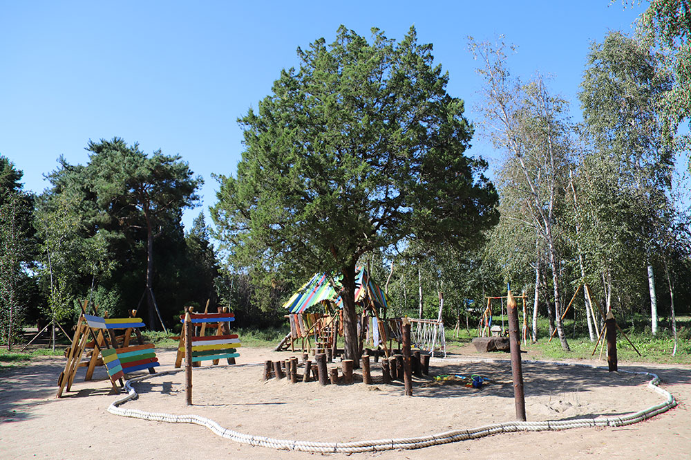 모험의 공간은 자작나무와 소나무 그늘에서 아이들이 놀 수 있는 모래놀이, 숲속모험, 나무쉼터 등이 있는 친환경 숲속 놀이터 입니다.