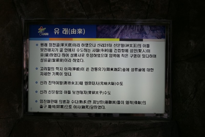 성류굴 내부로 들어가면 이와 같은 유래도 볼 수 있고,