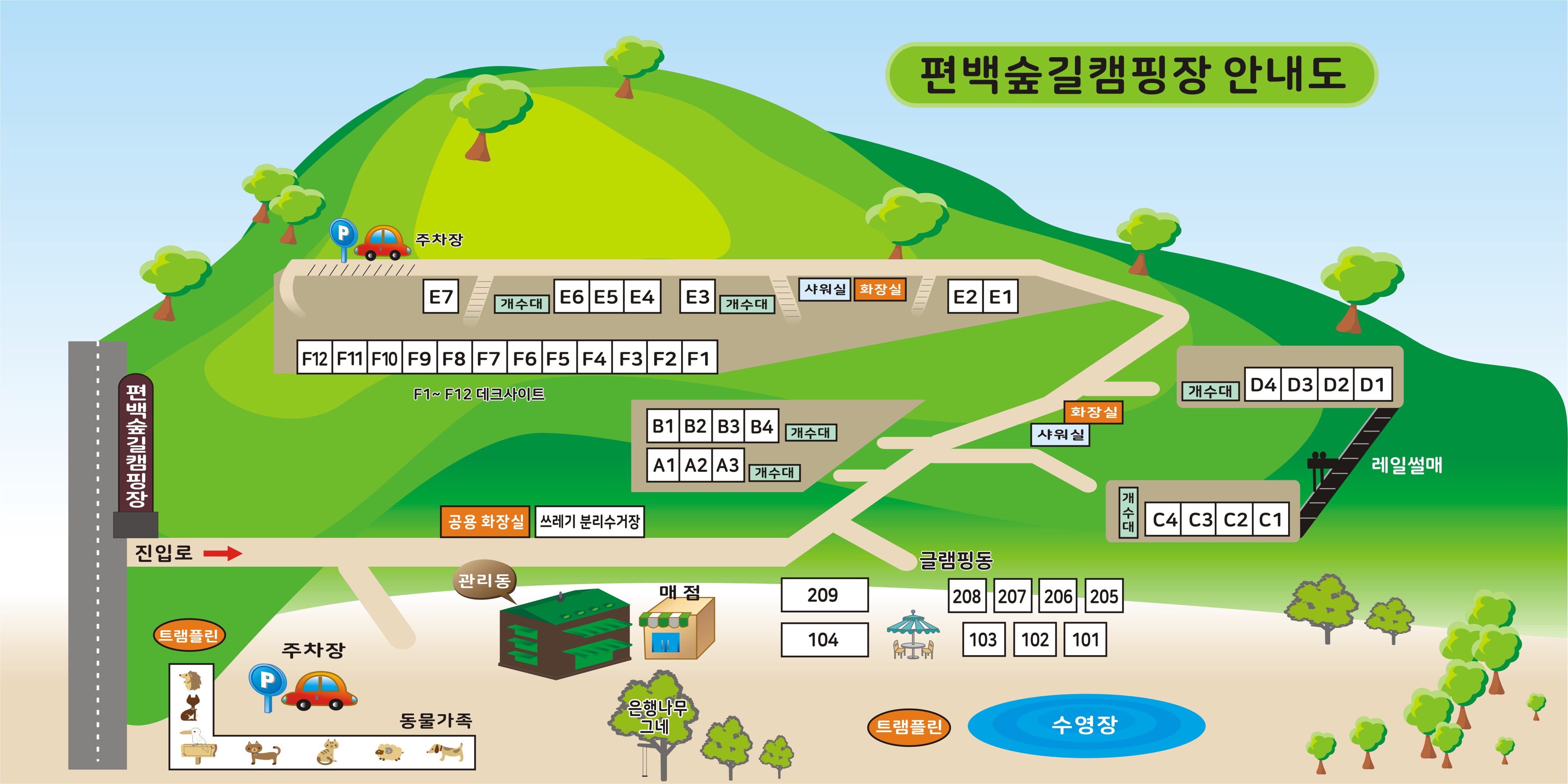 - 기본시설 : 화장실 / 개수대 2 / 온수샤워 / 전기가능 (리드선 각자 준비)