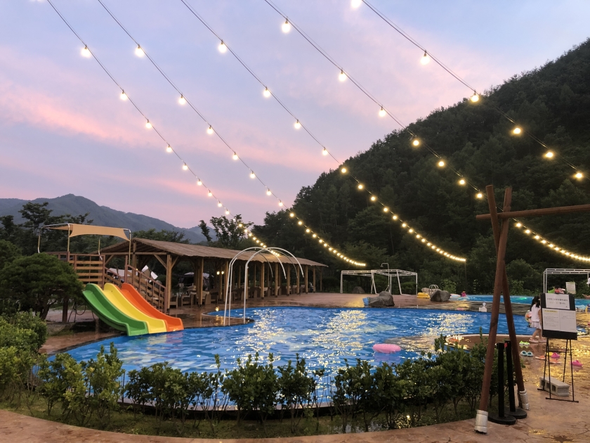 여름시즌(7, 8월)에 방갈로 글램핑을 이용하면 무료로 이용할 수 있으며, 다른 이용고객에게는 유료로 운영되고 있고, 봄, 가을에는 온수 풀장도 운영됩니다.