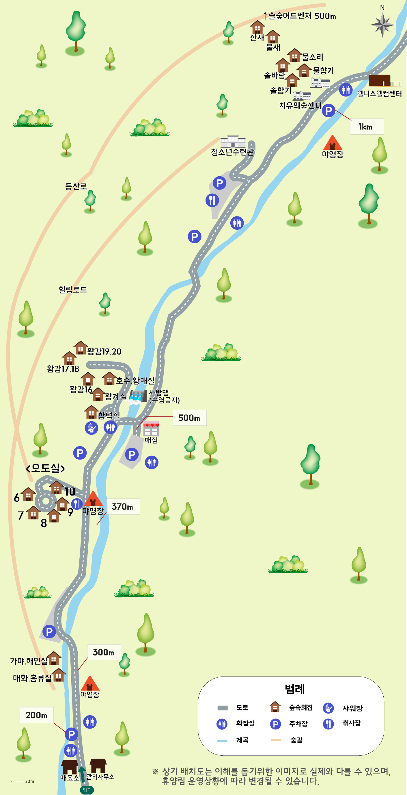 휴양림 내에는 등산로, 산책로, 야영장, 숲속의 집, 자연 물놀이장이 곳곳에 있어 아이들이 걱정 없이 물놀이를 할 수 있으며, 물놀이장 옆으로는 체육시설이 갖춰져 있어 운동도 할 수 있습니다.