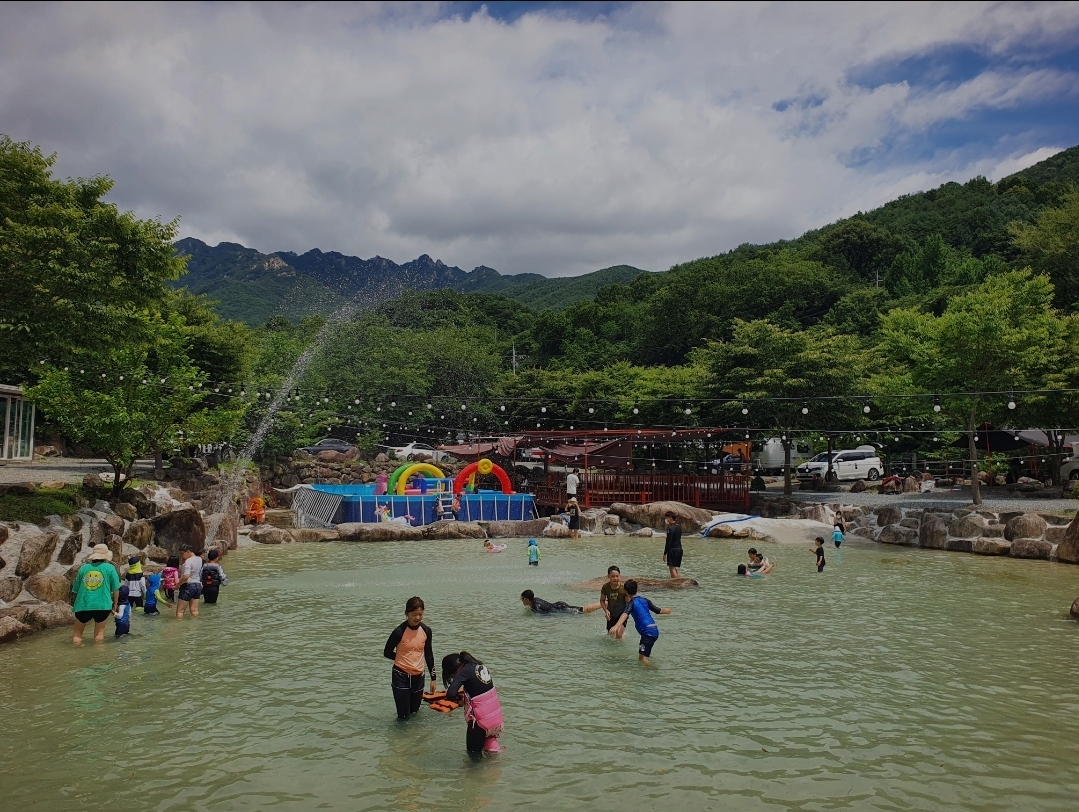 아이들이 좋아하는 트램펄린이 설치되어 있으며, 여름철에 넓은 수영장이 운영되어 특히 아이들이 좋아하고, 캠핑장 옆으로 계곡물이 흐르고 있어 물고기 잡기와 물놀이를 즐길 수 있습니다.