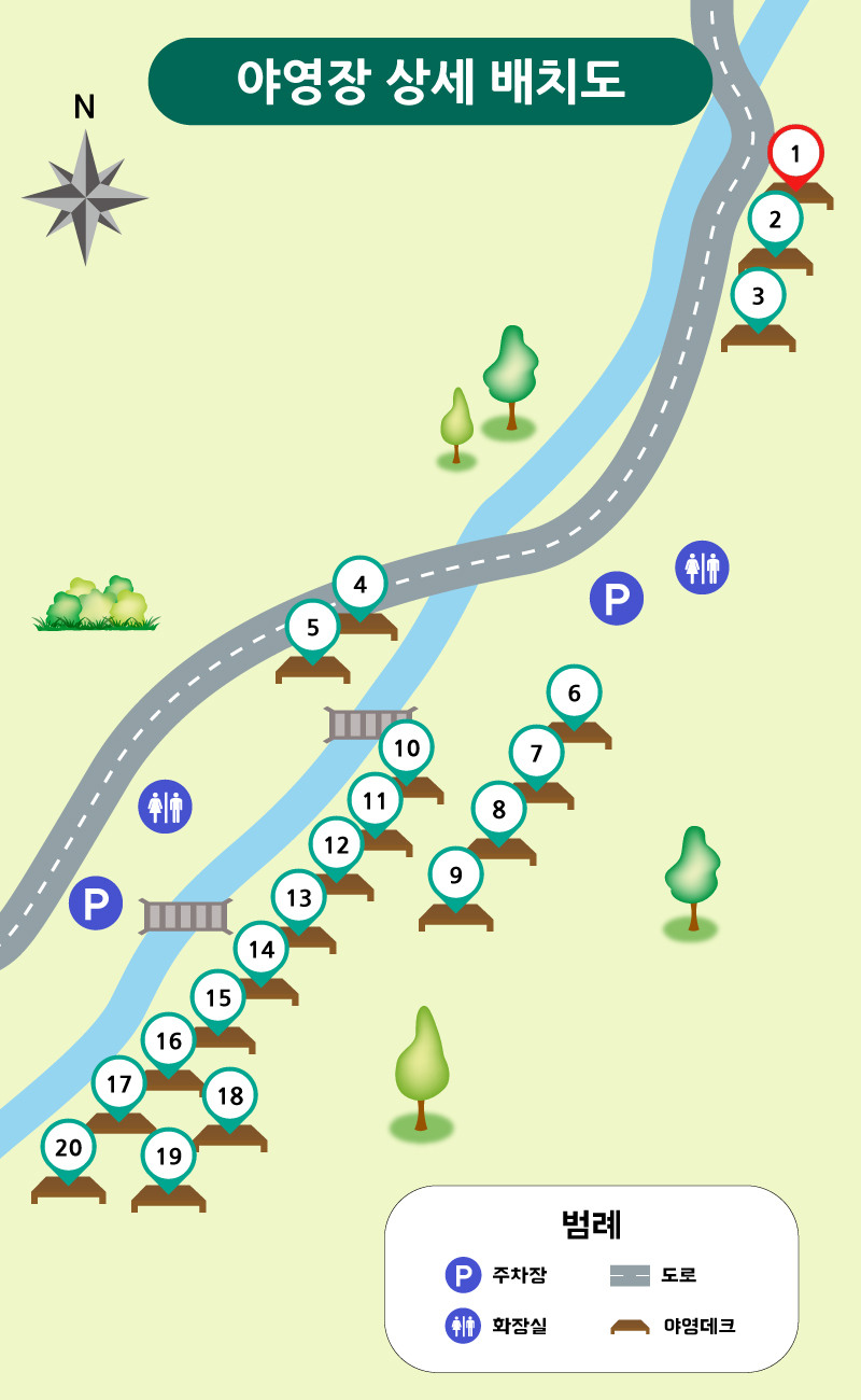 야영지 내 수목 및 지형지물의 훼손을 최소화한 자연 친화형 야영장으로 가족 단위 야영객을 비롯하여 많은 야영객들이 찾는 곳 입니다.