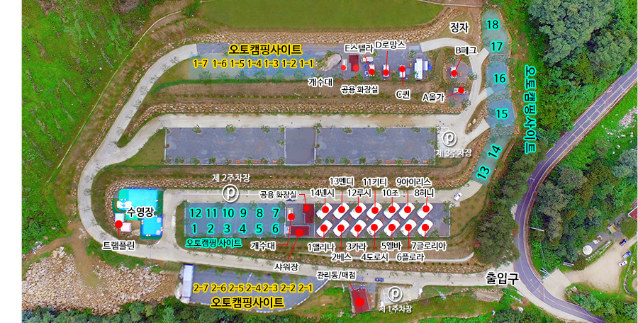 또한 캠핑장 중앙에 수영장과 트램펄린을 설치해 자녀 동반 캠퍼들은 자녀들의 모습을 한 눈에 볼 수 있게 구성되어 있습니다.
