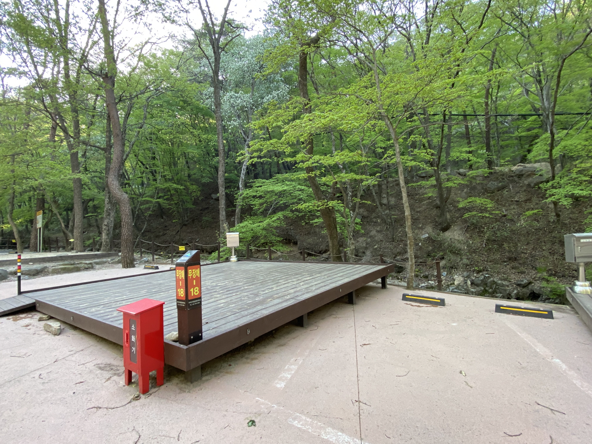 캠핑장은 나무다리와 야영 데크, 상부목교와 야영 데크로 구분되어져 있는데, 차량진입은 하부 야영장 데크는 진입 가능하나, 상부 야영장 데크는 주차 후 20~50m까지 도보로 걸어가야 합니다.