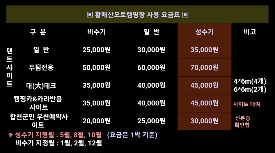 2. 이용요금 : 비수기 : 35,000원, 성수기 : 45,000원