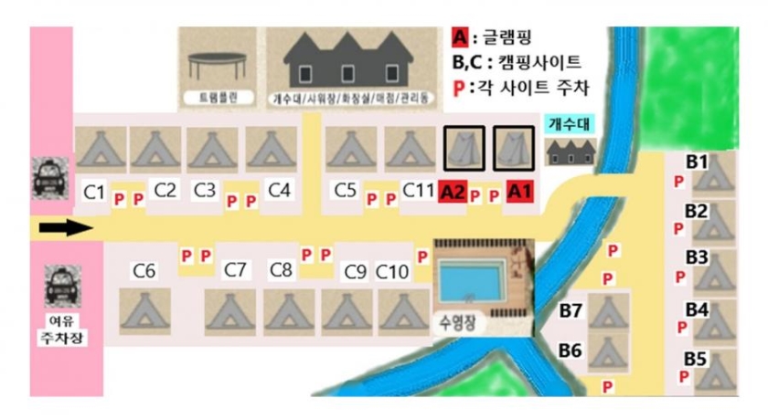 또한 캠핑장 중앙에 수영장과 트램펄린을 설치해 자녀 동반 캠퍼들은 자녀들의 모습을 한 눈에 볼 수 있게 구성되어 있습니다.