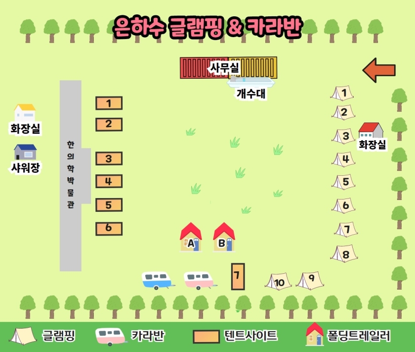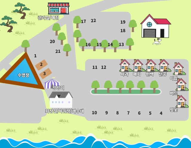 캠핑장은 조용하고 아기자기하며 미니 매점과 미니 도서관, 미니 커피숍 등 공간 활용을 잘 한 캠핑장입니다.