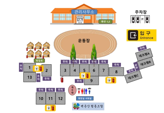 교실은 관리실 및 편의시설, 체험장등으로 사용하고 학교운동장 옆 나무그늘을 중심으로 캠핑사이트가 조성되어 있습니다.