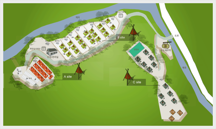 캠핑장은 A, B, C 총 3구역으로 나눠져 있으며 A사이트는 가장 높은 곳에 위치하고 있어 삼봉산 및 멀리 함양 시내를 조망할 수 있고 사이트 바로 옆으로 계곡이 흐르고 쉼터가 자리하고 있어 최적의 자리입니다. B사이트는 중간에 위치하고 있어 편의시설을 이용하기에 좋으며 계단식으로 조성되어 있어 조용한 공간을 찾는 캠퍼들에겐 안성맞춤이고, C사이트는 하단에 위치하고 있는 자리로, 앞으로는 큰 계곡이 흐르고 있으며 옆으로는 작은 계곡에서 맑은 물이 쉼 없이 흘러나오고 있습니다.