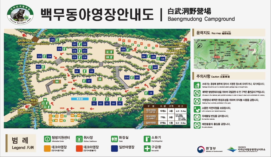 백무동야영장은 백무동계곡의 초입에 위치한 야영장으로 장터목대피소와 세석대피소로 오르는 탐방로가 조성되어 있습니다.