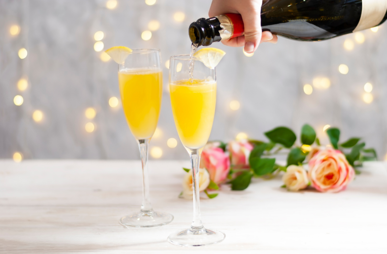 플루트 글라스에 오렌지 주스와 샴페인을